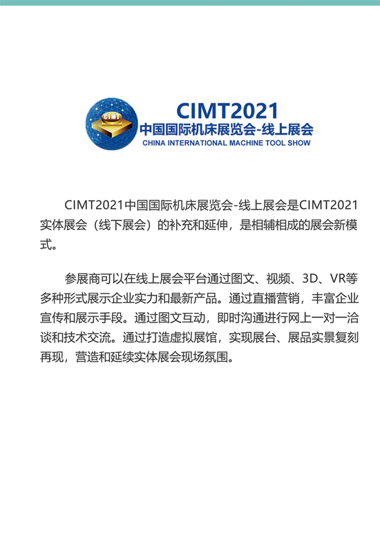 為適應行業數字化轉型升級需求,提升觀眾的觀展體驗,第十七屆中國國際機床展覽會(CIMT2021)首次推出配套的線上數字展會。作為線下實體展會的補充和延伸,在CIMT2021展會開幕前和舉辦期間,線上展將配合進行有針對性的預熱和宣傳,并將在線下展結束后的4月18日正式開幕,展期1個月。