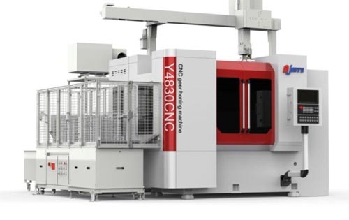 南京二機展出的數控內齒珩輪強力珩齒機Y4830CNC,配置自主知識產權的用戶軟件,能夠自動實現強力珩削工藝以及自動余量補償。工作臺進給軸采用直驅技術,智能化夾持力控制及自動熱變形補償技術,確保高精度齒輪的珩削要求。工件相位檢測及自動對齒技術,實現珩齒加工的自動化。