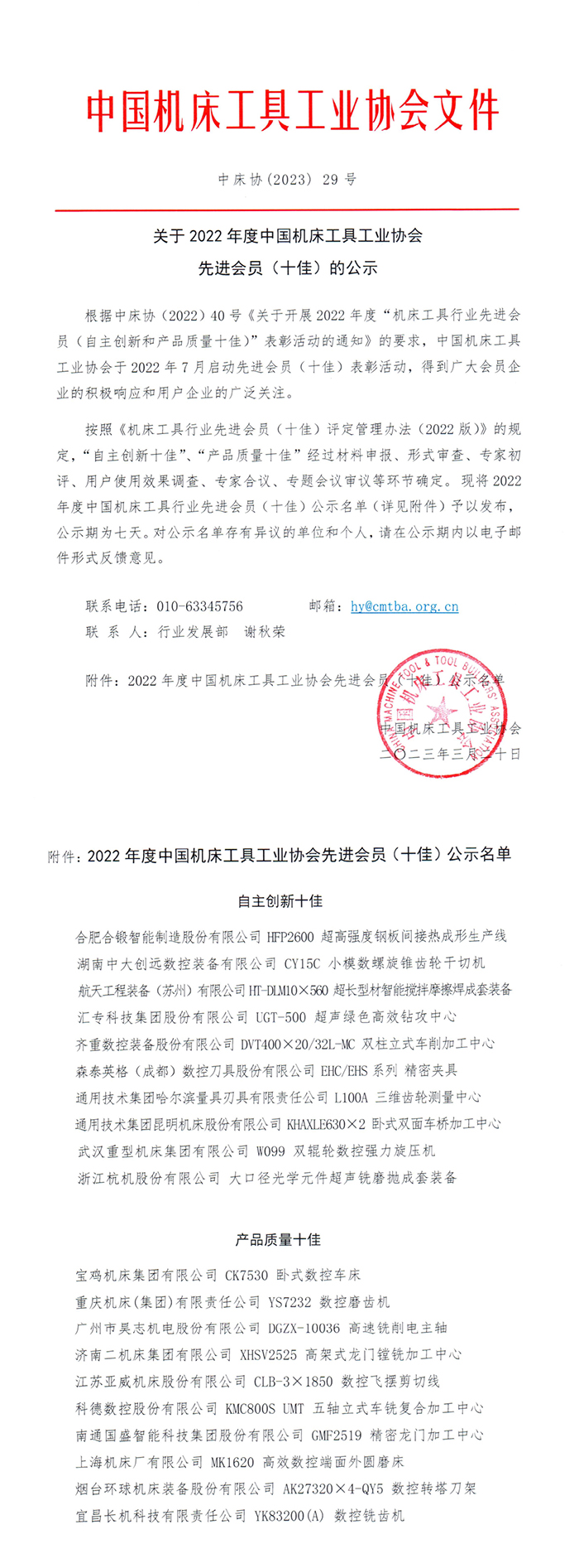關于2022年度中國機床工具工業協會先進會員(十佳)的公示