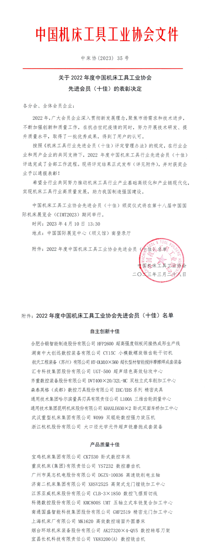 CIMT2023(第十八屆中國國際機床展覽會)開幕在即,中國機床工具工業協會將于展會開幕首日即4月10日13:30舉行先進會員(十佳)頒獎儀式,地點在中國國際展覽中心(順義館)南登錄廳。