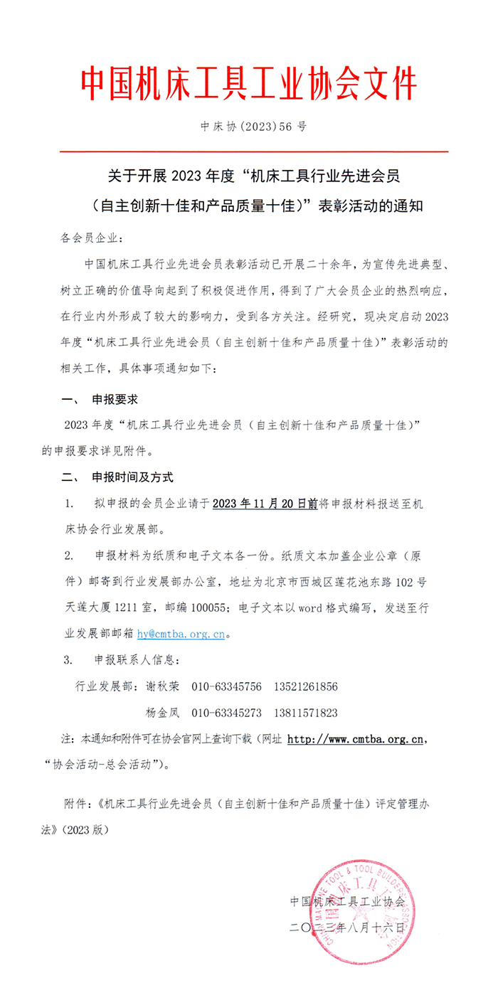 經研究,協會決定啟動2023年度“機床工具行業先進會員(自主創新十佳和產品質量十佳)”表彰活動的相關工作,具體事項詳見以下文件。請申報企業注意時間節點,于2023年11月20日前將申報材料報送至機床工具協會行業發展部。