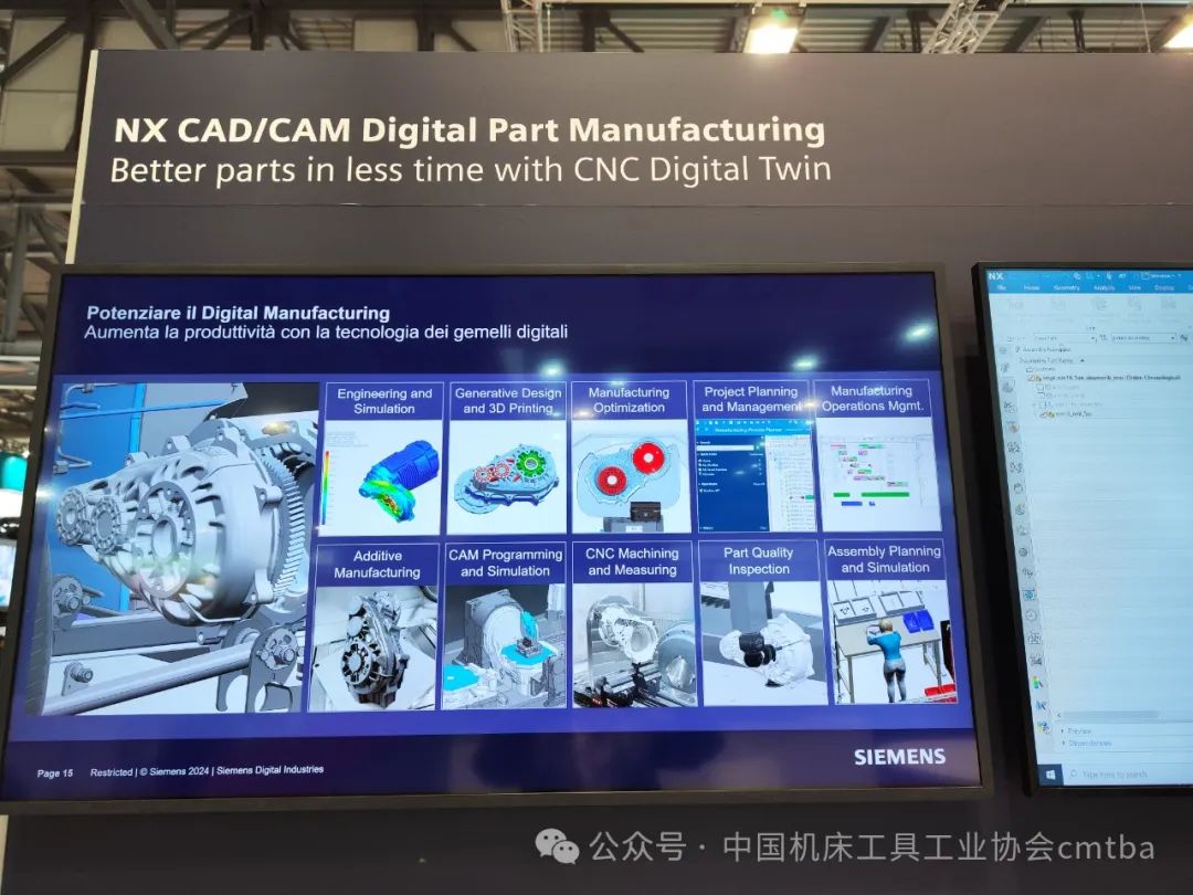 德國SIEMENS公司展示了SIEMENS NX集成式制造系統軟件,可以對機械、電氣等部件進行輔助設計,進行工藝編程、仿真、生產規劃、車間數據聯通和流程管理,應用于數控加工、機器人、3D 打印和質量檢測工序。