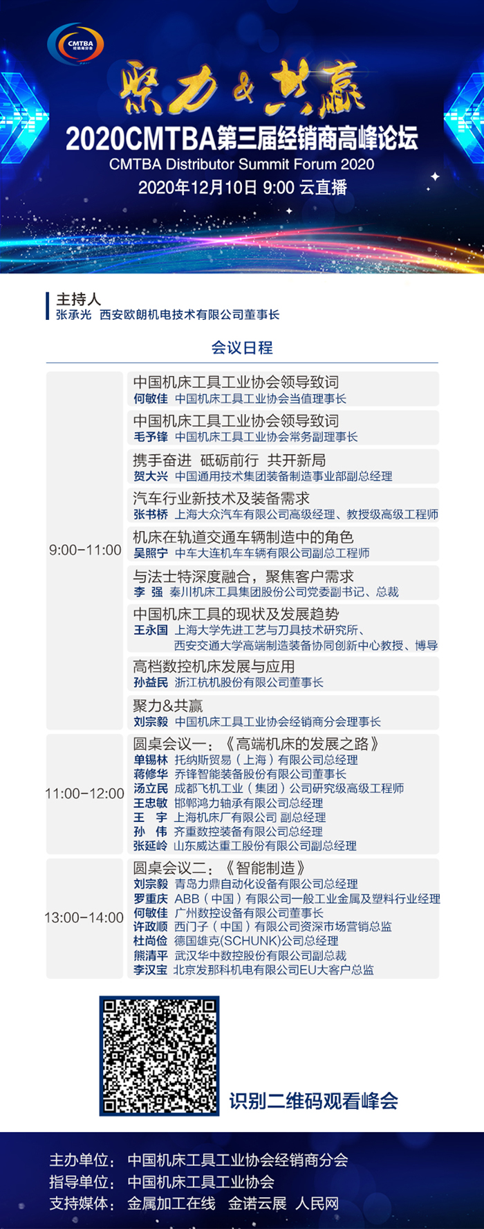 由中國機床工具工業協會經銷商分會組織的“2020CMTBA第三屆經銷商高峰論壇”于今天(12月10日,星期四)上午9點準時開播。考慮到疫情原因,本屆峰會不進行大規模聚集召開,除在青島召開主論壇外,組織了分設在沈陽、泊頭、常州、西安、成都、青島的6個線下分會場,由所在片區的經銷商副理事長牽頭,與經銷商、專家、客戶、制造商們進行面對面的深度交流。
